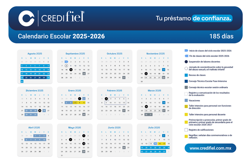 El calendario escolar se publica cada año por la autoridad educativa. Aplica para escuelas públicas y privadas del país.